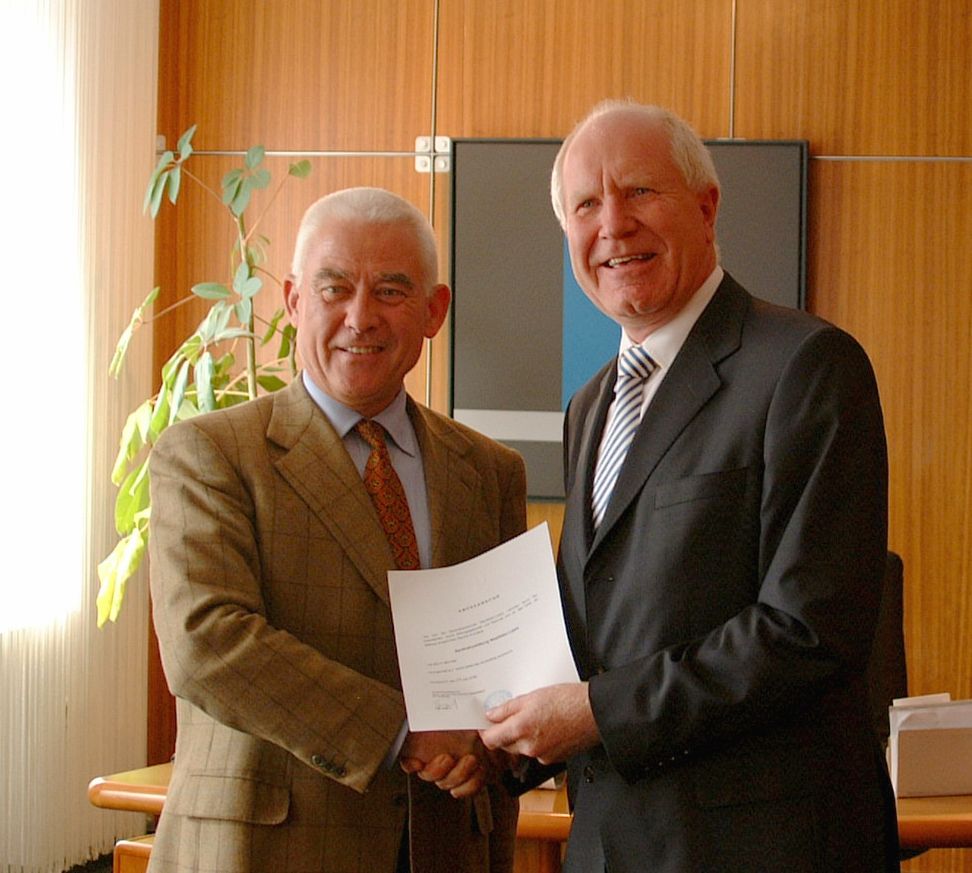 Hans-Günter Friese, damaliger Präsident der Apothekerkammer Westfalen-Lippe, erhielt am 24. August 2006 aus den Händen von Regierungsvizepräsident Alfred Wirtz die Anerkennungsurkunde für die Apothekerstiftung Westfalen-Lippe.